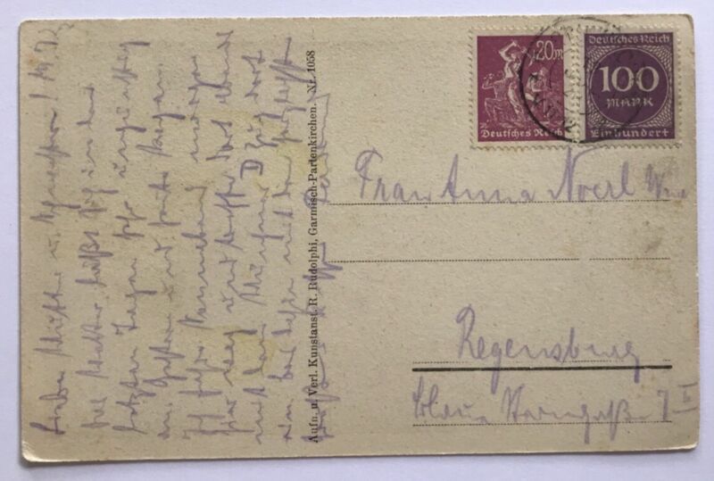 AK Partenkirchen mit Dreitorspitze - Infla 1923 nach Regensburg