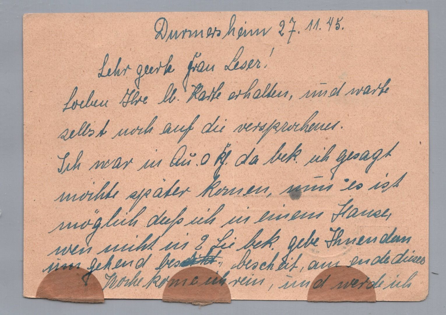 Alliierte Besetzung Schwärzung - Gebühr bezahlt - Antwort-Postkarte Durmersheim nach Karlsruhe 1945