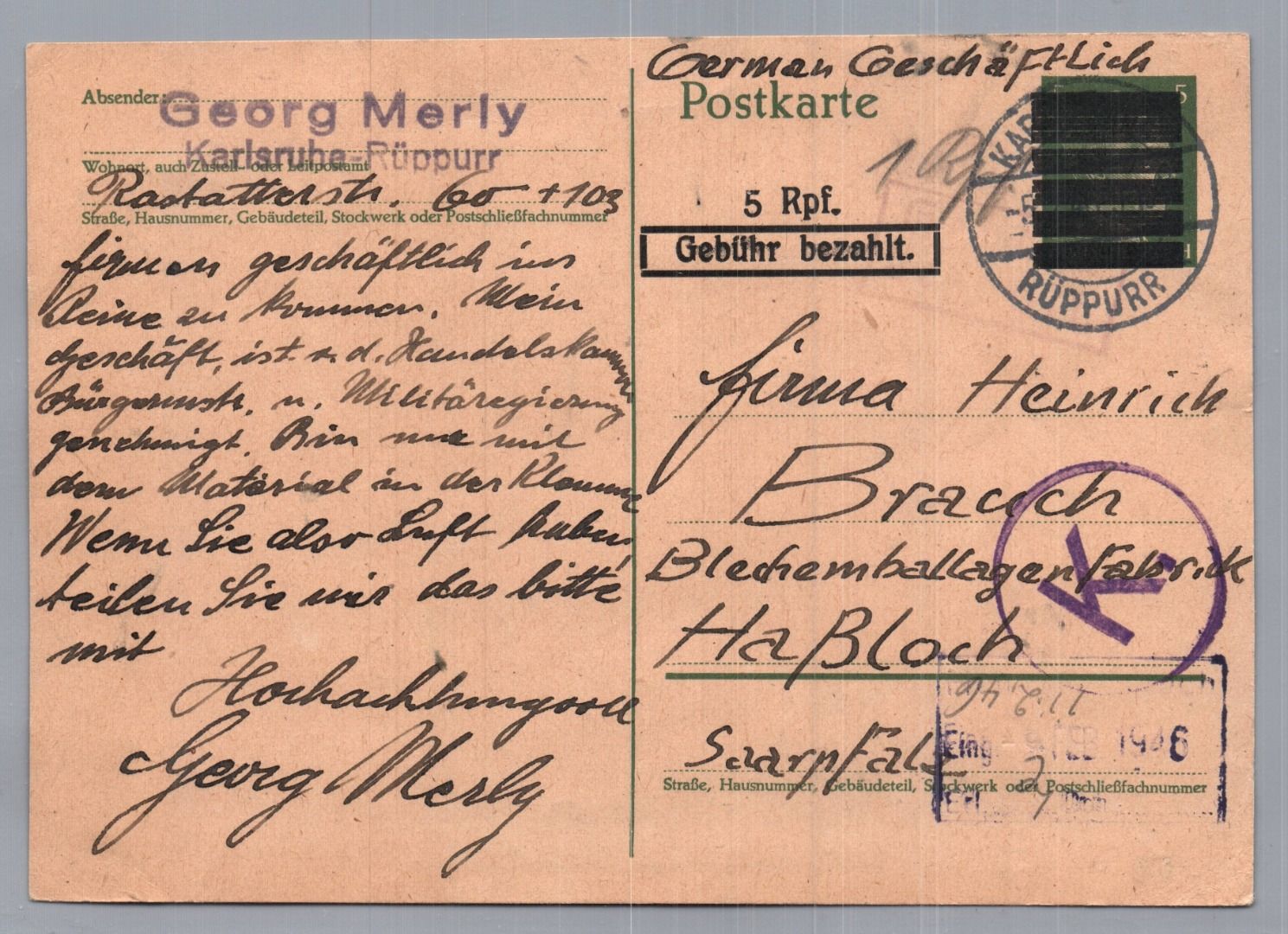 Alliierte Besetzung Schwärzung Gebühr bezahlt - Karlsruhe nach Haßloch 1945