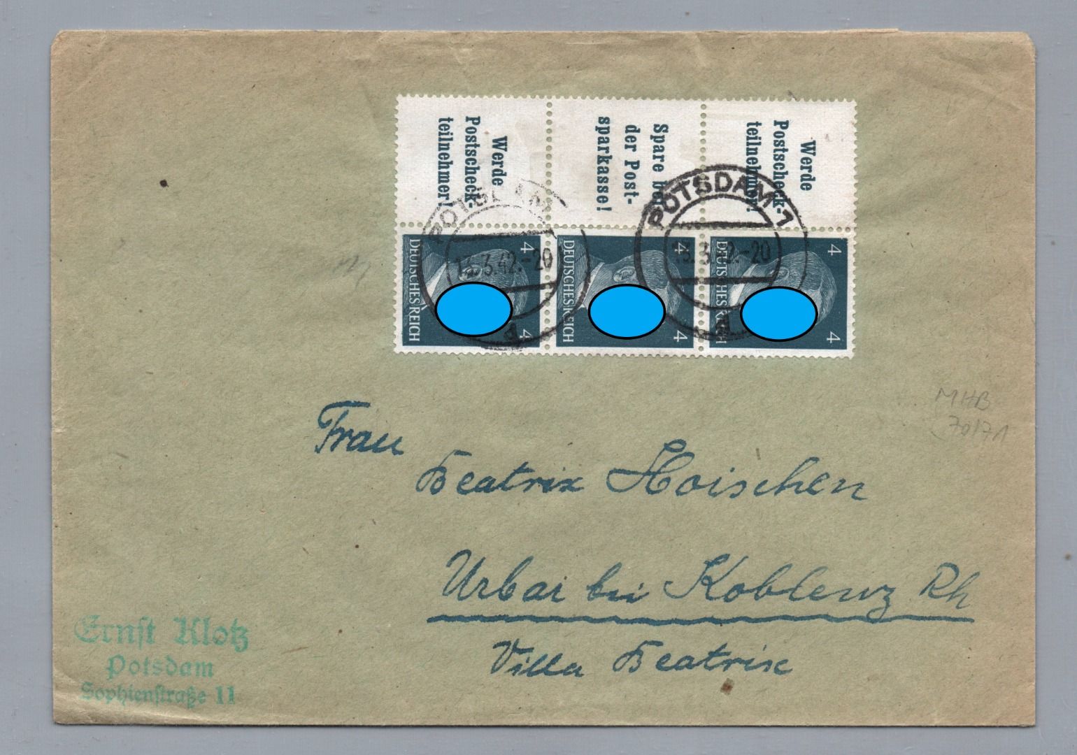 Brief Dt. Reich MiNr W156 + W 152 - Potsdam nach Koblenz 1942