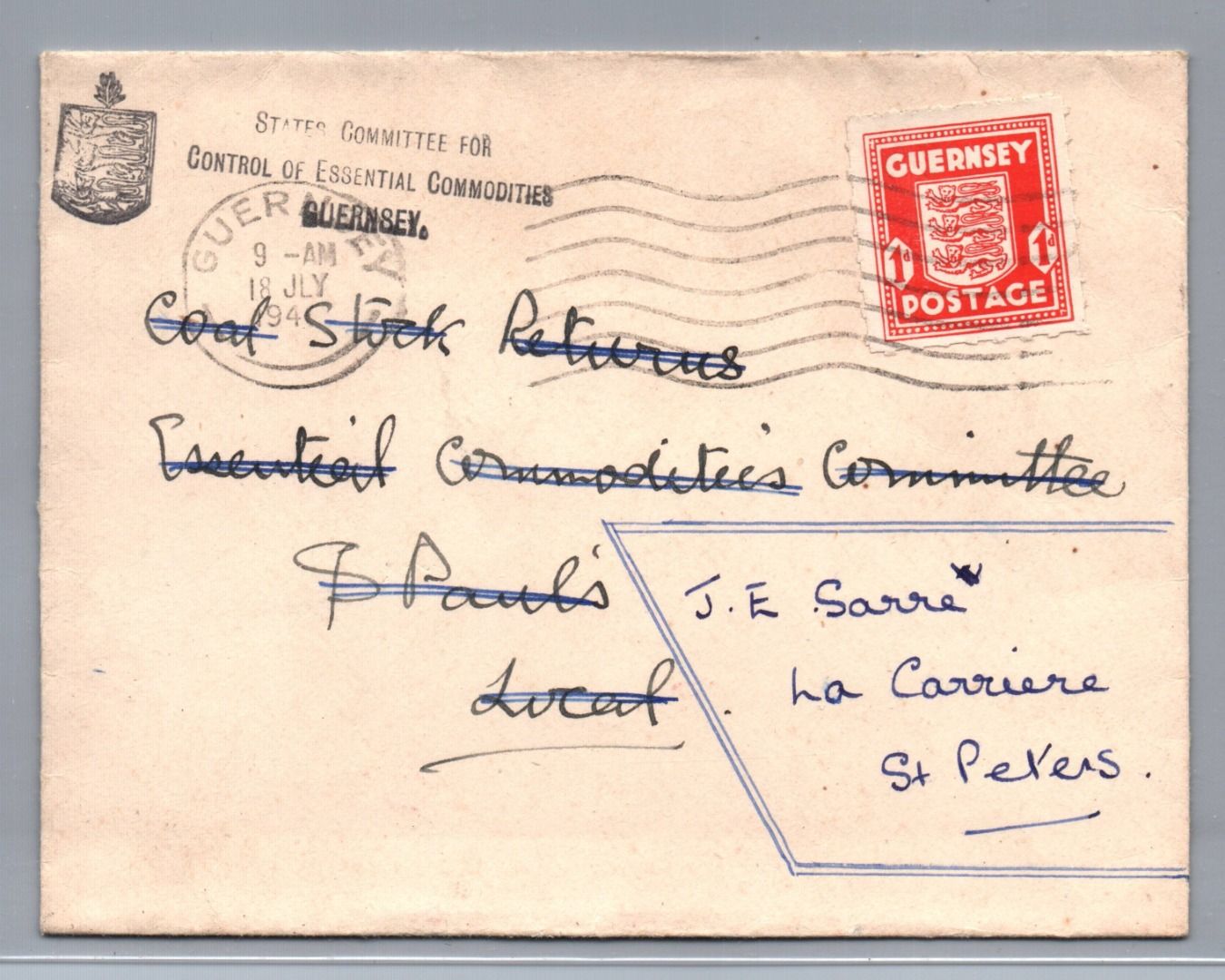 Brief Guernsey EF 1941 nach St Peters
