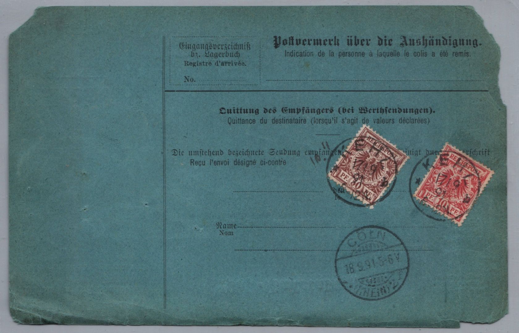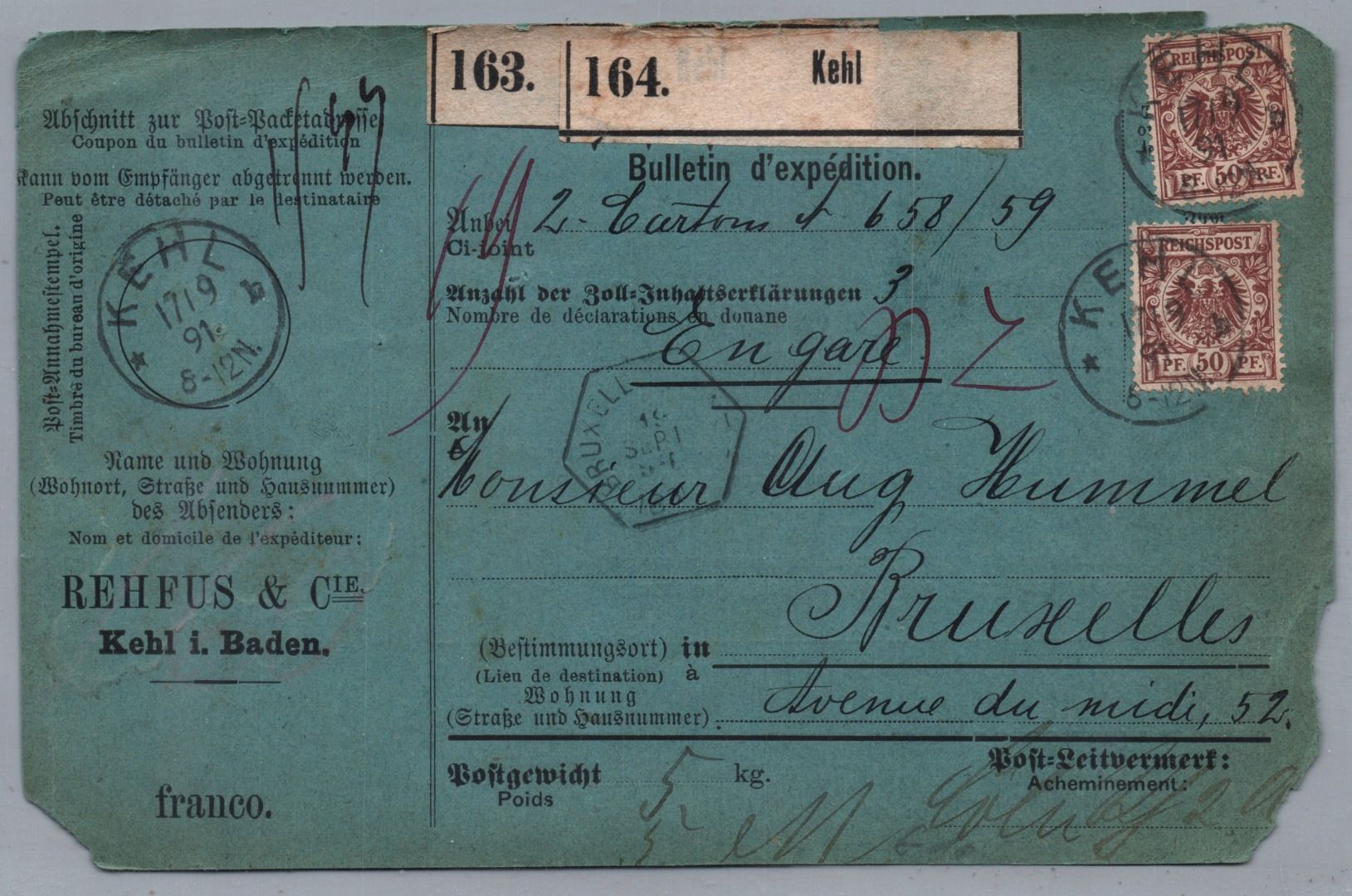 Dt. Reich Auslands Paketkarte MiF MiNr 50 - 1891 - Kehl über Cöln nach Brüssel Belgien