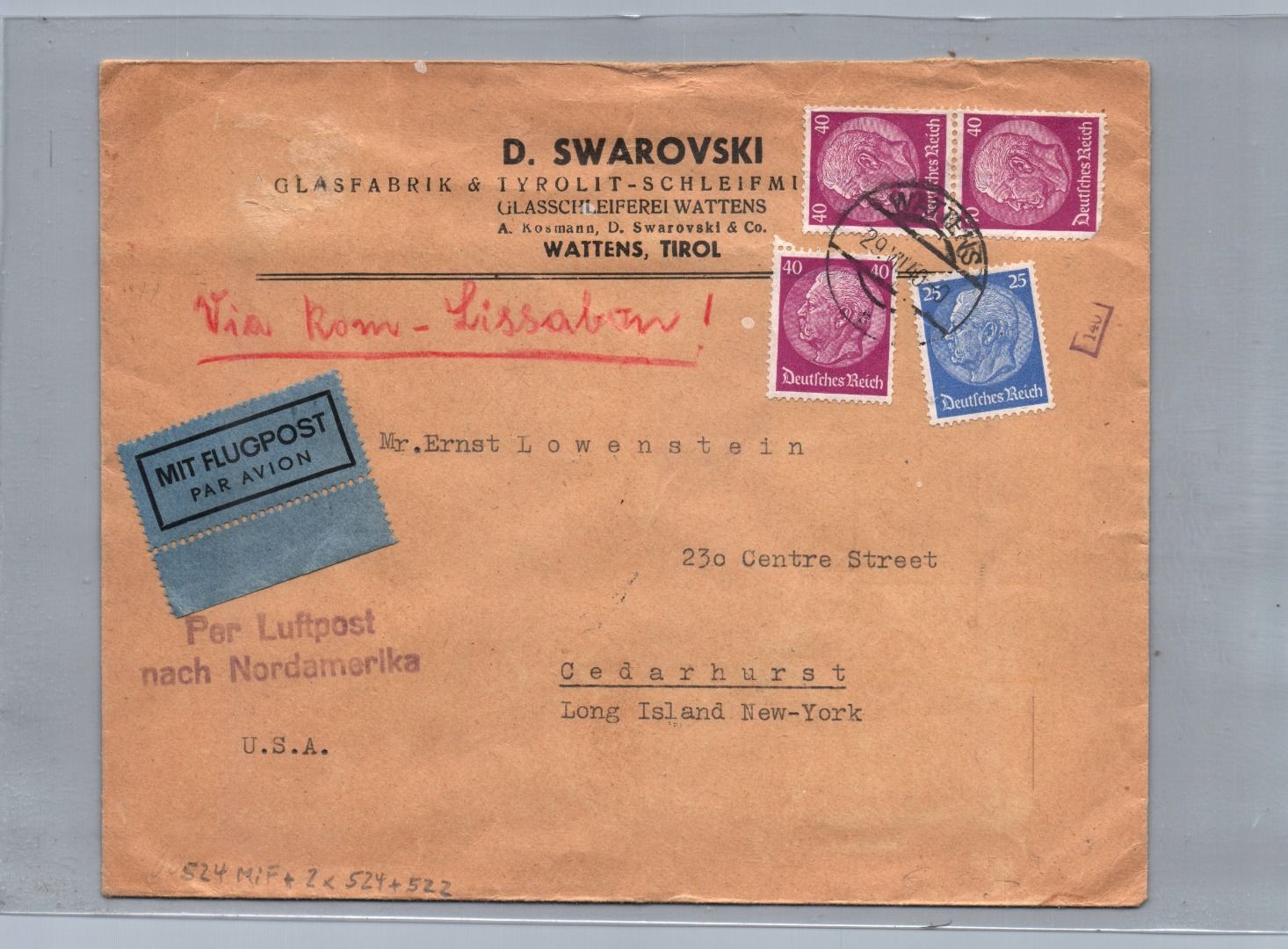 mit MiNr 524 + 522 MiF Wattens Tirol nach Cedarhurst Long Island New York USA 1940 + Zensur