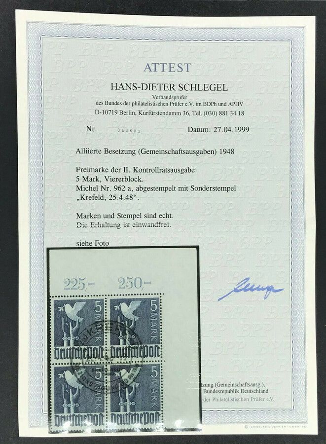 Alliierte Besetzung Viererblock Nr. 962 a - Sonderstempel Krefeld 25.4.1948 - Attest Schlegel