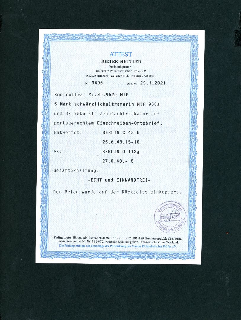 Alliierte Besetzung Kontrollrat 962c MiFr. 960a +950a Einschreiben Ortsbrief Berlin