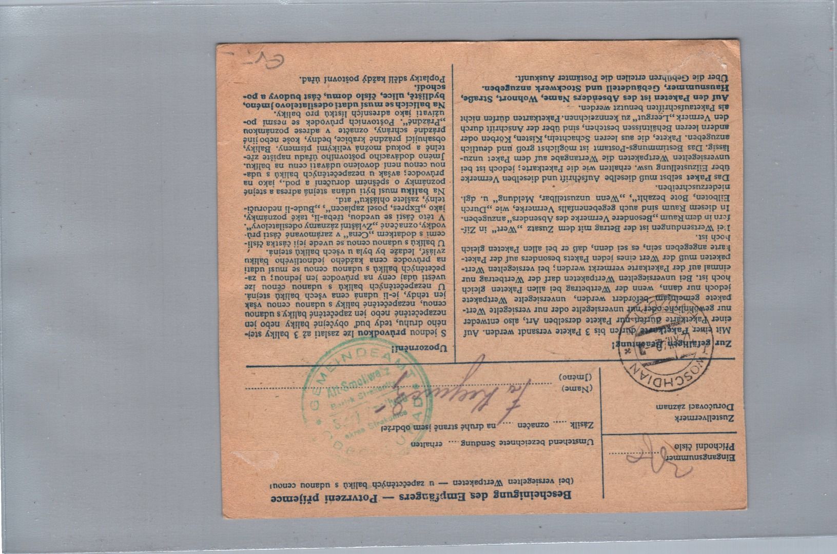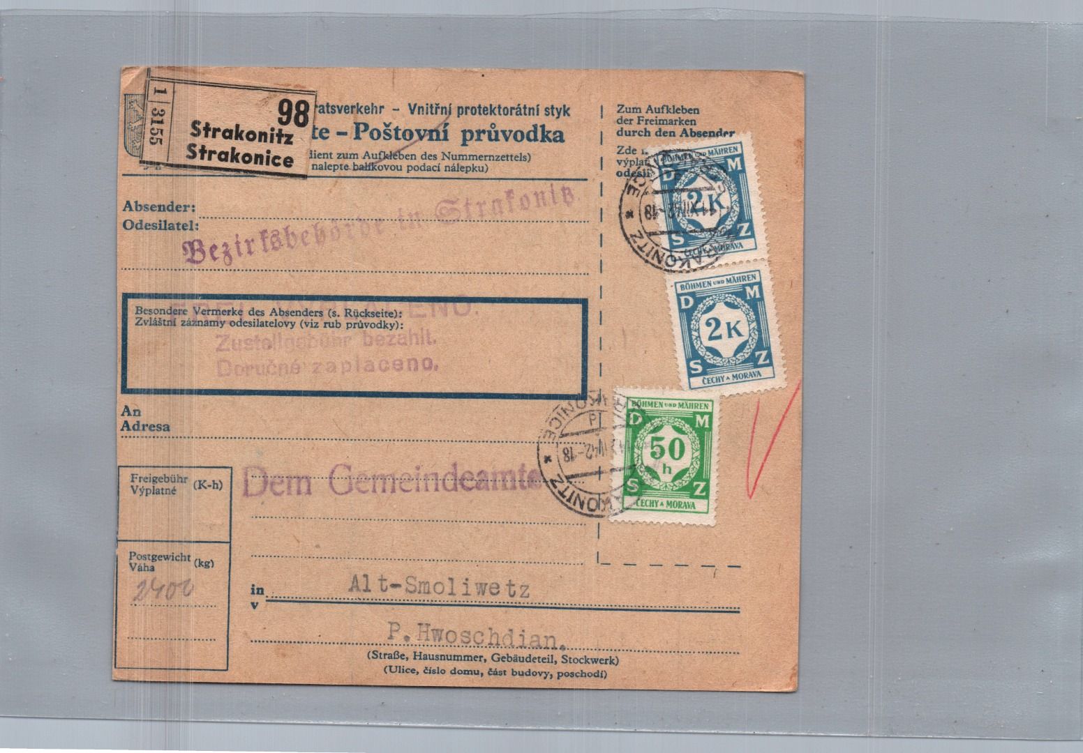 Böhmen und Mähren - Paketkarte Strakonitz nach Smoliwetz 1942