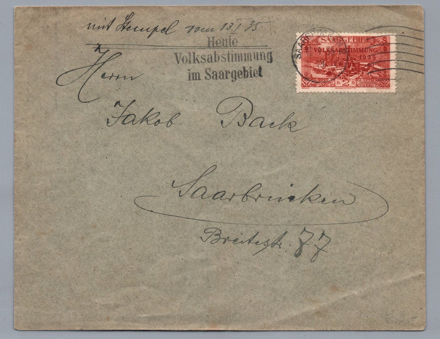 Dt. Reich Brief - Volksabstimmung im Saargebiet + SST Saarbrücken 13.1.1935