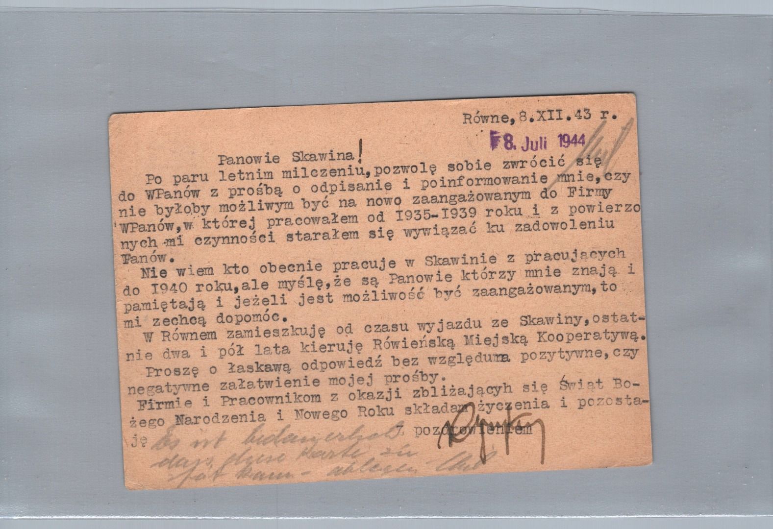 Dt. Reich Diensstpost Ukraine Karte Rowno nach Skawina bei Krakau 1943