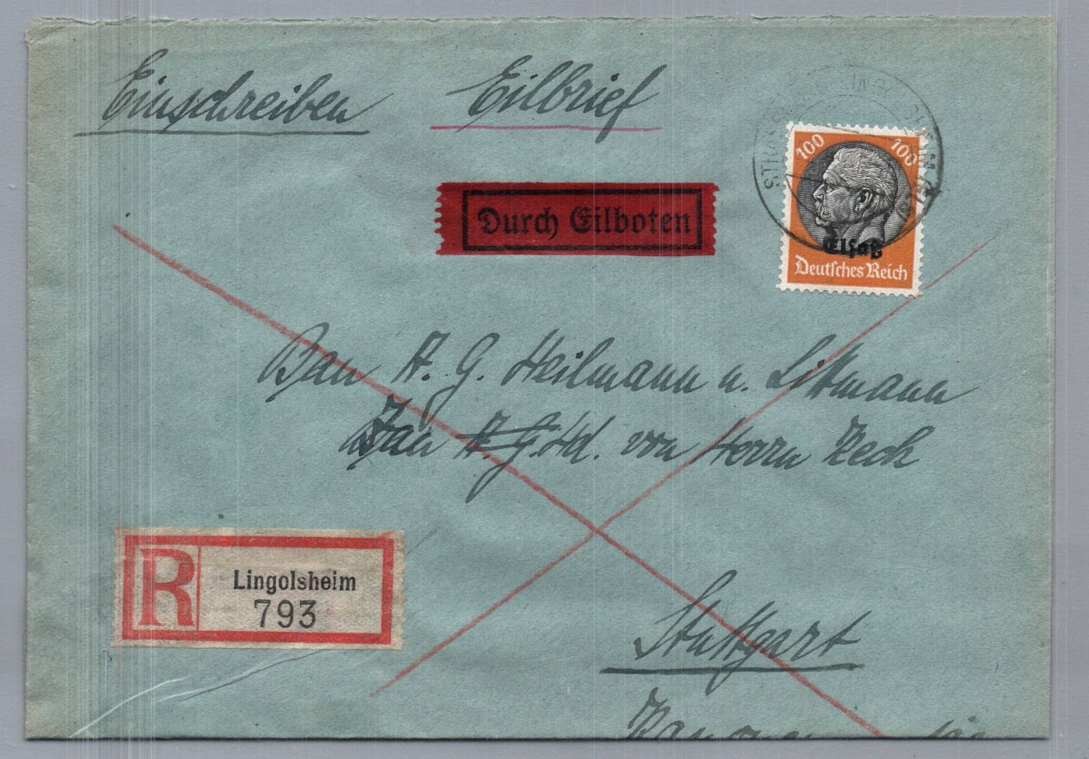 Dt.Reich Eilboten Brief Besetzung Elsaß Einschreiben Straßburg Lingolsheim nach Stuttgart 1941