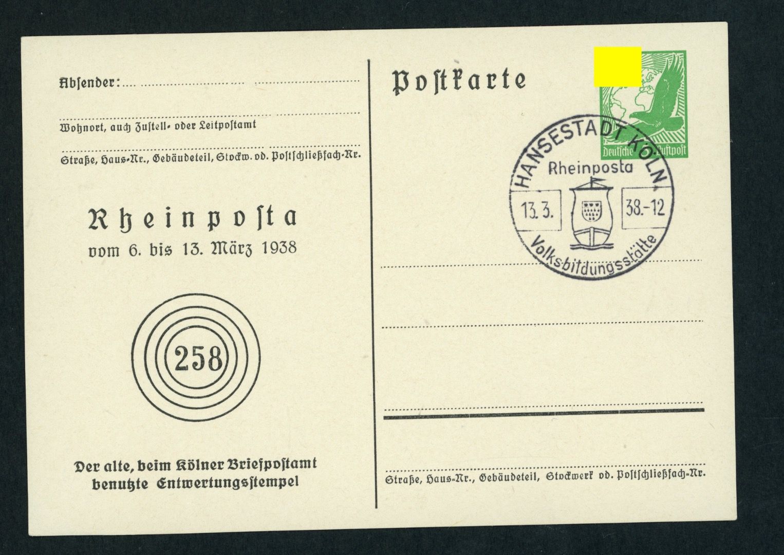 Ganzsache Rheinposta 1938 mit Sonderstempel Köln