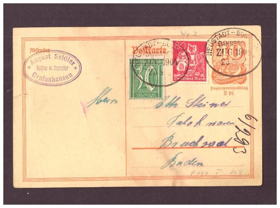 Infla Ganzsache P 141 - Tabakfabrik / Grafenhausen Neustadt nach Bruchsal - 1922