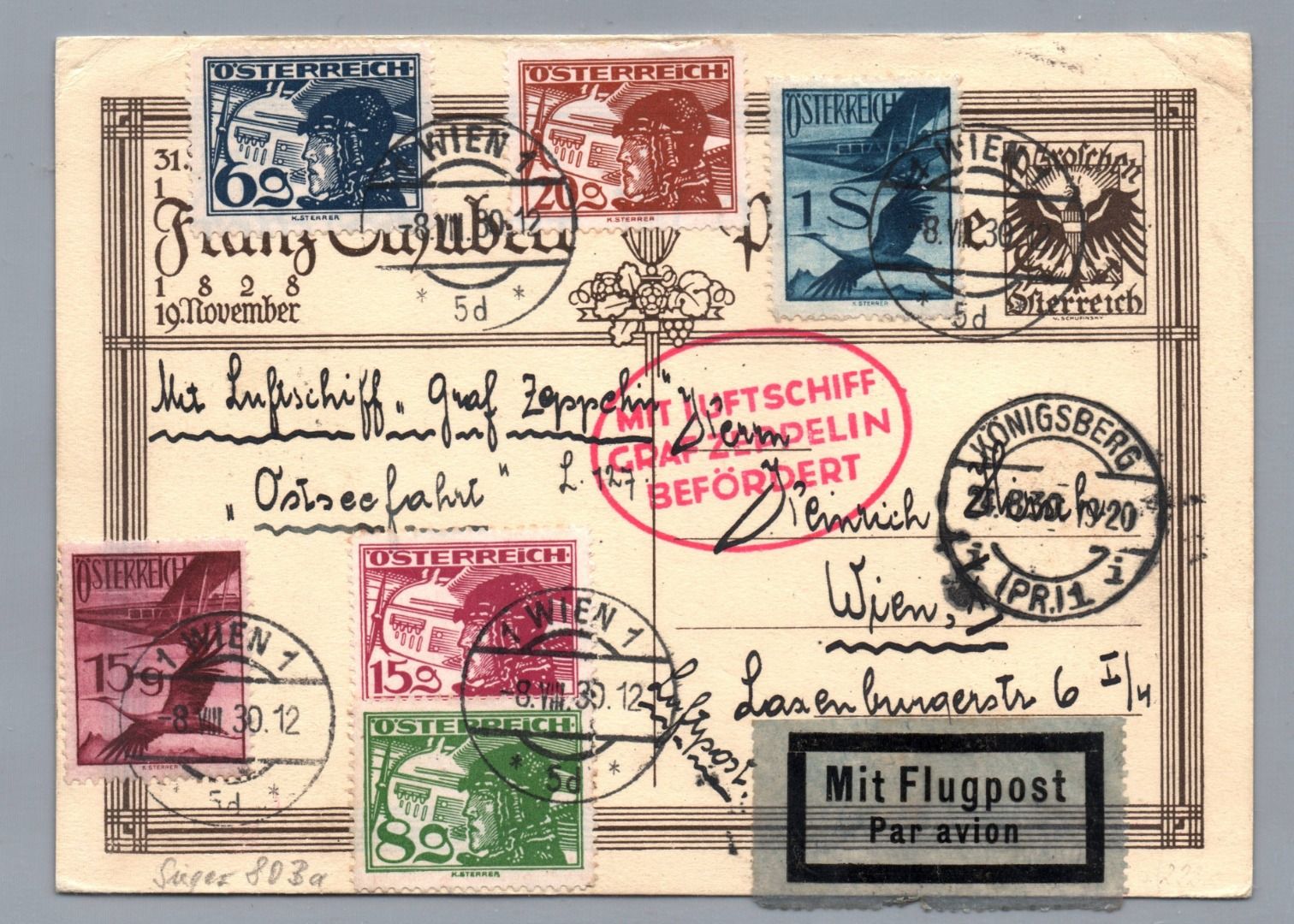 Luftpost Graf Zeppelin Beleg Ostpreussenfahrt 1930 - Ab Wien Friedrichshafen nach Königsberg mit allen Stempeln. Bildpostkarte Ganzsache mit Zusatzfrankatur