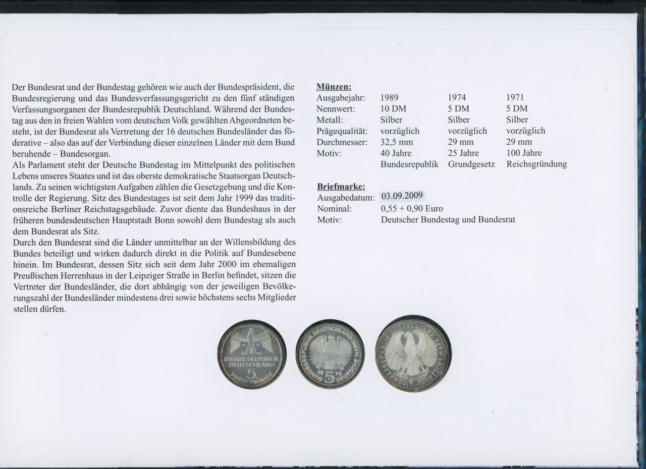 Numisbrief Bundestag / Bundesrat 2009 10 DM + 2x 5DM