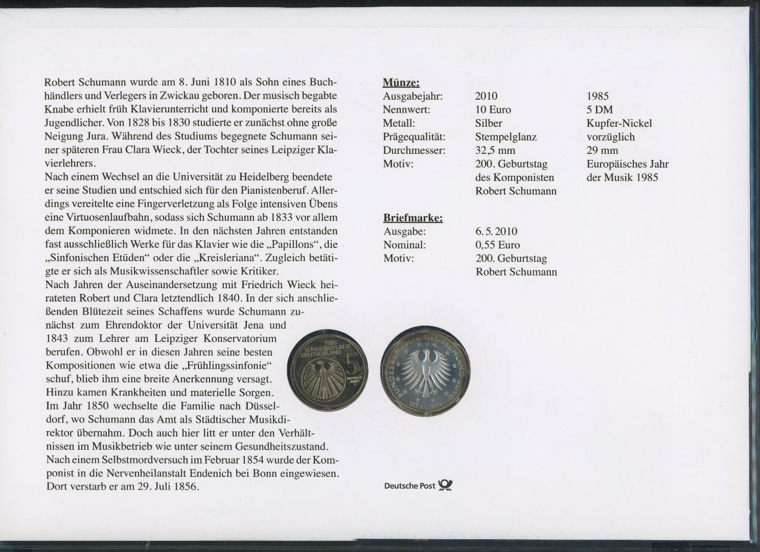Numisbrief mit 10 EUR + 5 DM Robert Schumann 2010