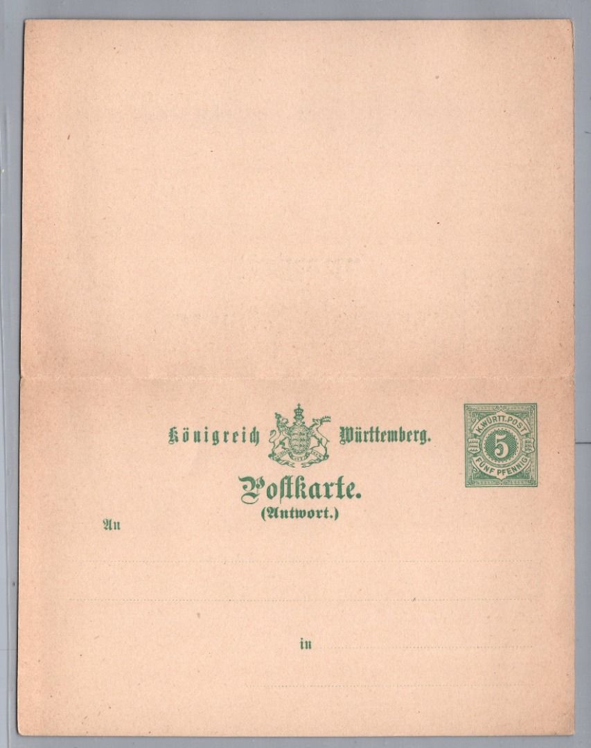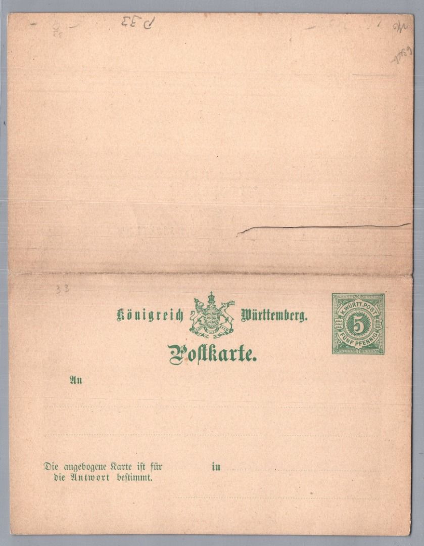 Württemberg Ganzsache P 33 - ohne Strich unter der 3. Zeile - ungebraucht