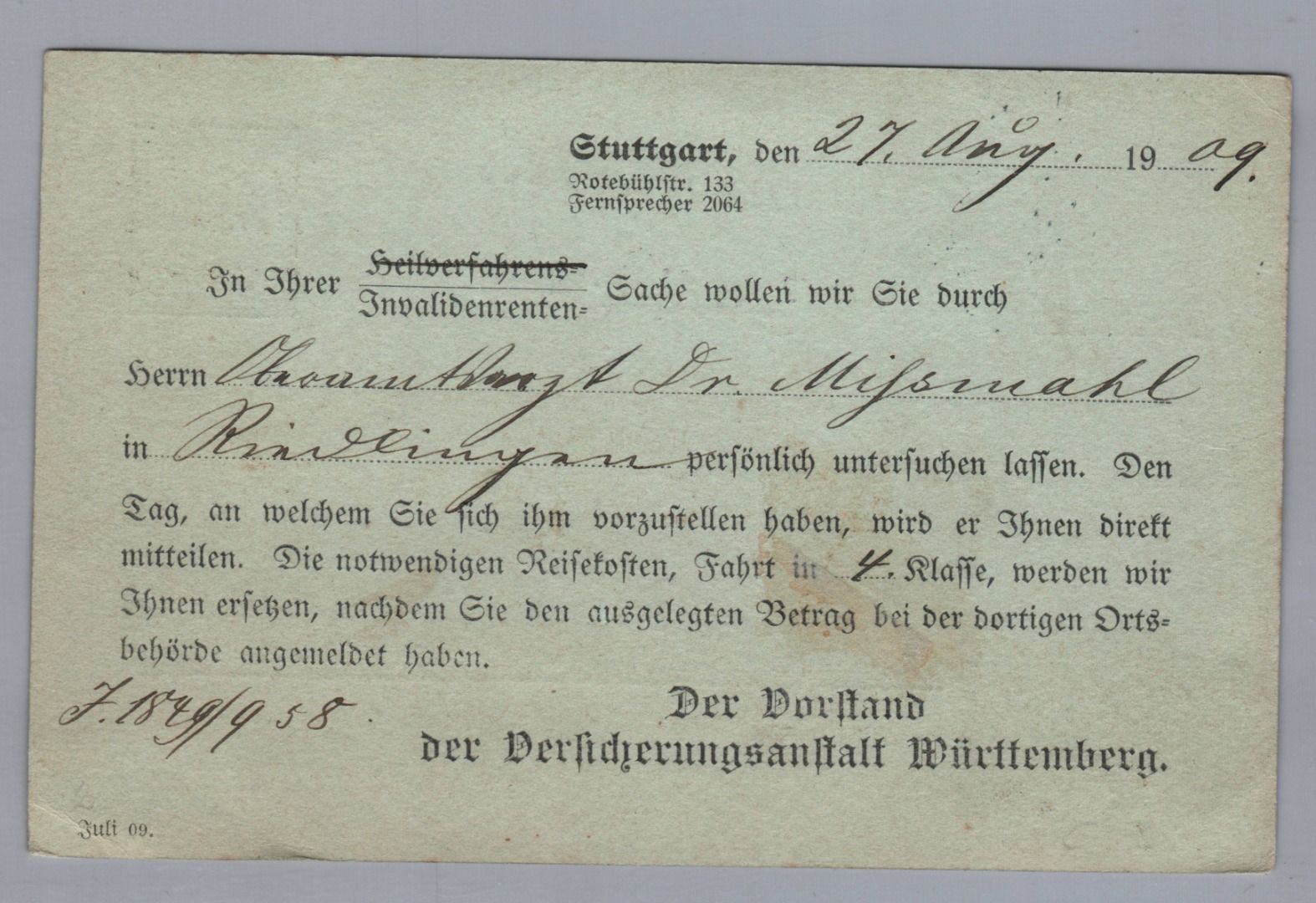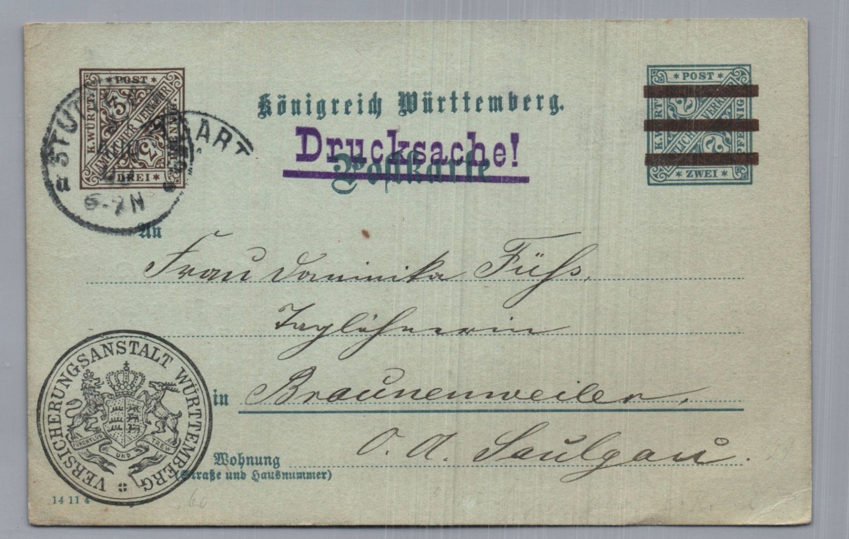 Württemberg Ganzsache Drucksache - Versicherungsanstalt Stuttgart nach Braunweiler 1909