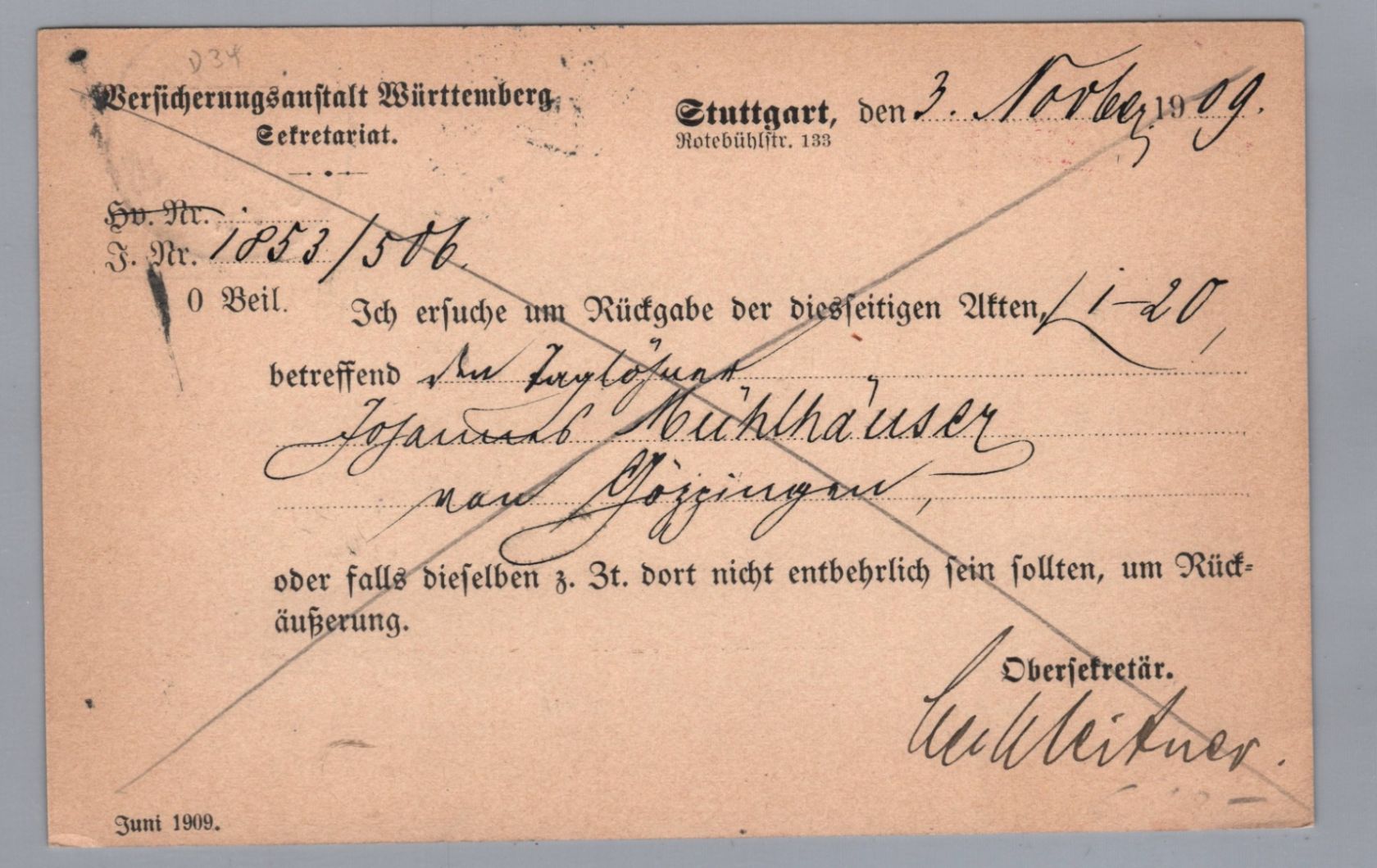 Württemberg Ganzsache - Versicherungsanstalt Stuttgart nach Plochingen 1909