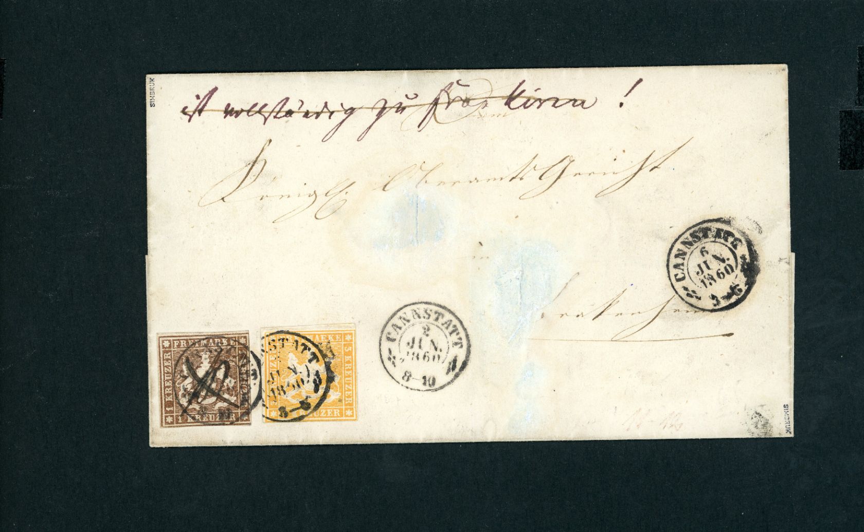 Württemberg MiFr 11a , 12a , K2 Cannstatt 2 , unterfrankiert + nachfrankiert , aufgegebener Brief nach Brackcenheim